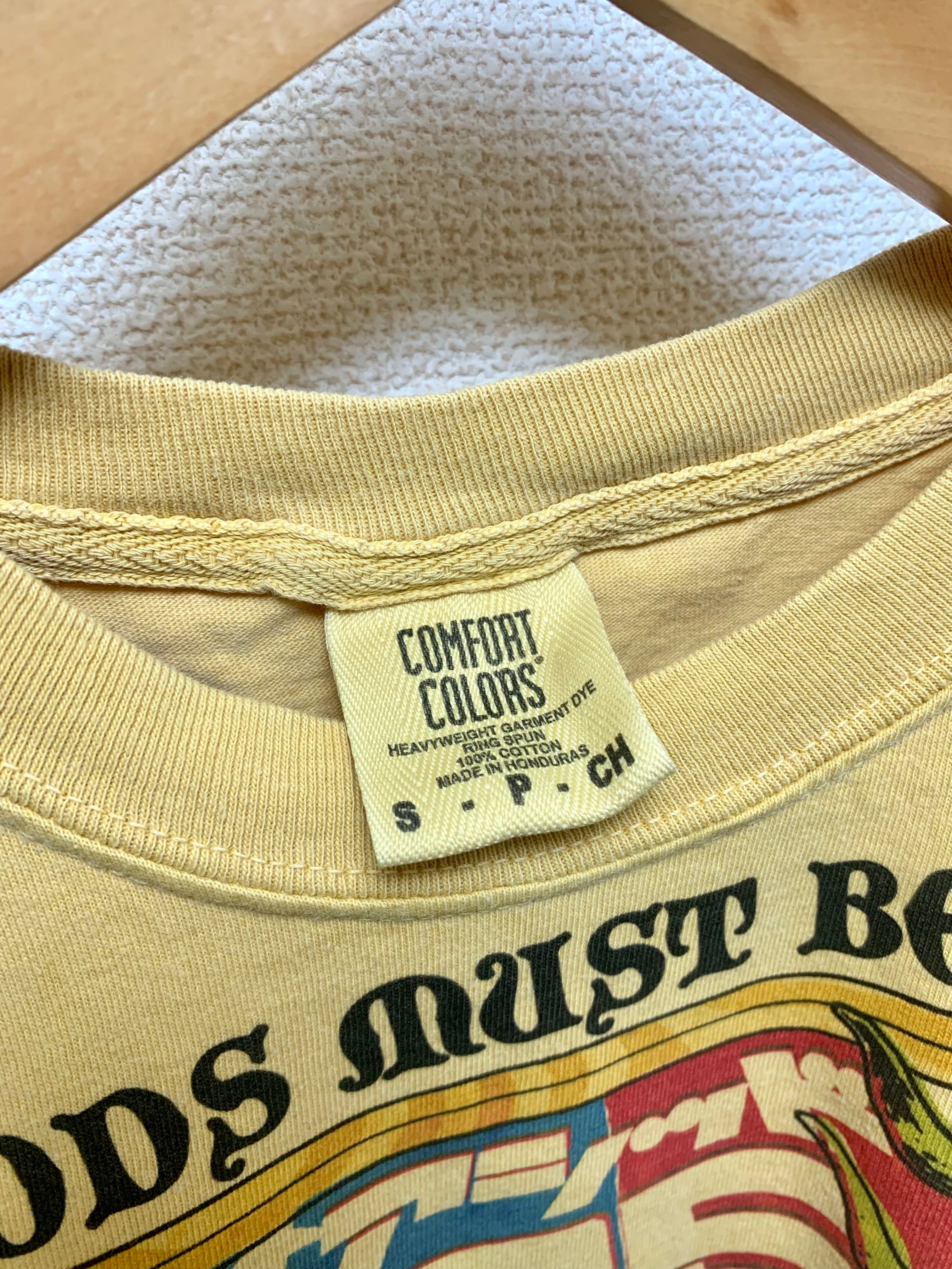 色は黄土色って感じです。コンフォートカラーらしい味のある染めはアフリカ感ムンムンです。フロントいっぱいの大プリントで満足度高し。